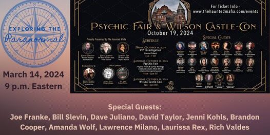 Exploring the Paranormal, along with many other guests from the upcoming Paracon/Psychic Fair/Roaring 20’s Ball on October 19th at Wilson Castle in Vermont. Come and join us live tonight as we talk all about this amazing event coming up.